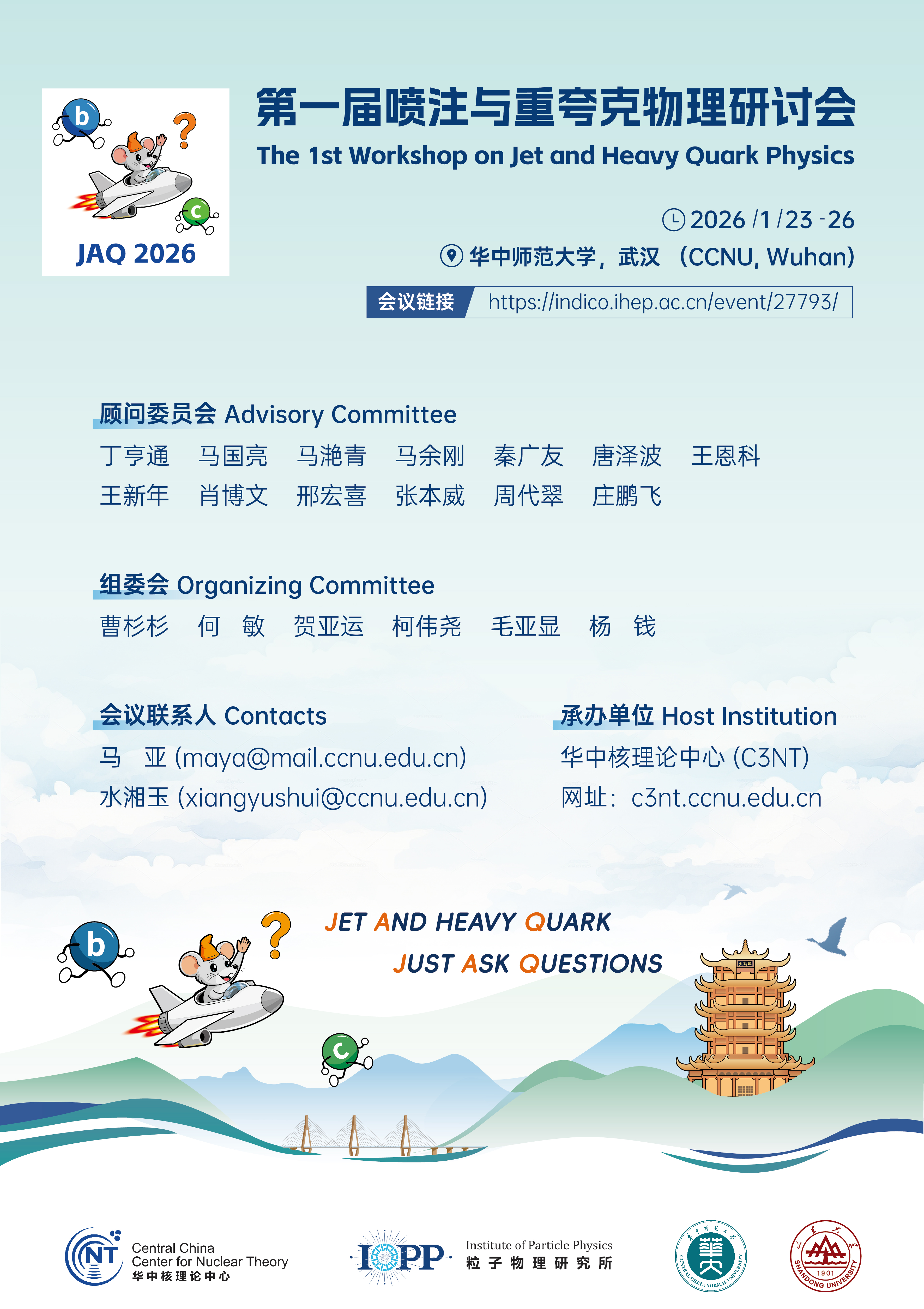 极端高温高密度环境下 QCD 物质会形成以夸克和胶子为基本自由度的解禁闭形态——夸克胶子等离子体 (QGP)。相对论重离子碰撞中喷注与重夸克的核修正效应为 QGP 的形成提供了有力证据,并成为进一步定量研究 QGP 性质的理想“硬探针”。本次研讨会将围绕喷注与重夸克,探讨它们在相对论重离子碰撞中精确提取 QGP 性质方面的理论与实验进展,以及它们在未来电子离子碰撞里探究冷核性质中的应用。