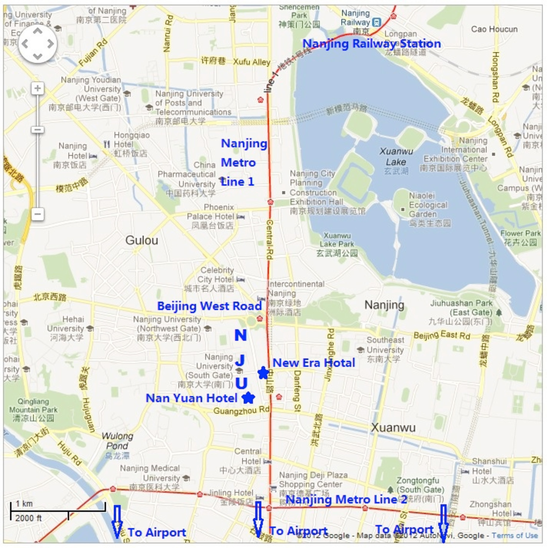 Nanjing Train Station -> toward Olympic Stadium Station or CPU Station, to get off at Zhujiang Road Station, and to find Nanjing University, or the New Era Hotel;The ride takes approximately 10 minutes, the fare is 2.00 RMB.